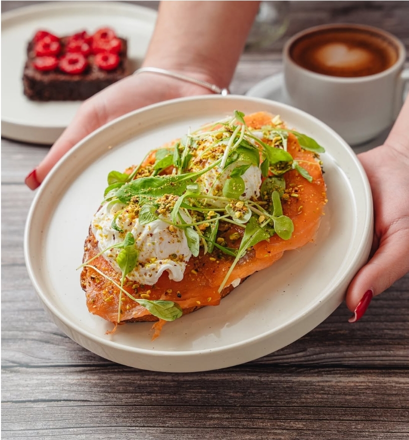 • 1 tostada de masa madre con salmón, huevo poché, queso crema y rúgula.